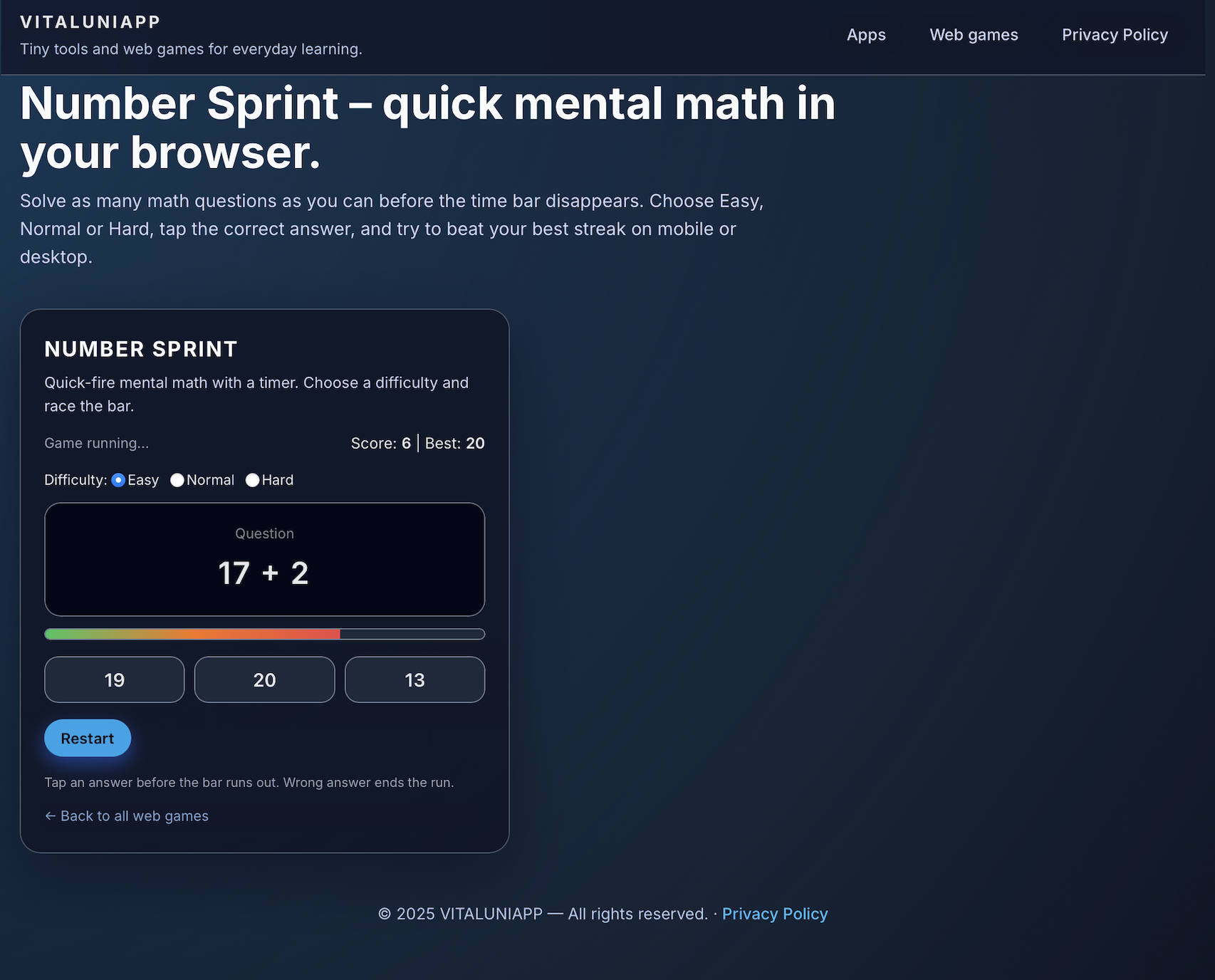 | Tags | Brain Training, browser, html5, logic, Math, Quiz, Real-Time, Singleplayer |